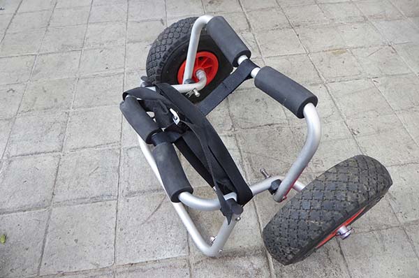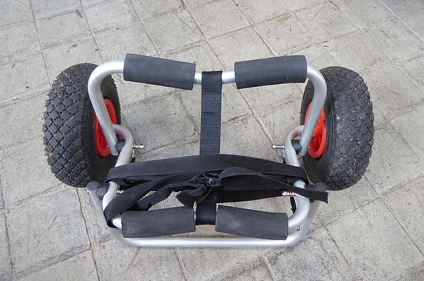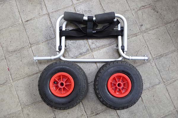 Bootswagen mit Stütze. Mit wenigen Handgriffen leicht zu zerlegen. Paßt in jedes Faltboot, Kajak oder Kanu. Luftbereift.